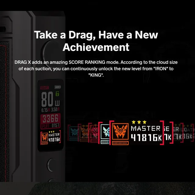 Le symbole de frein le plus classique est la deuxième aspiration extrêmement rapide, et le Kit Voopoo Drag X continue cette ligne. La puce TT offre une vitesse d’allumage de 0.001 seconde et une puissance de sortie allant jusqu’à 80W, ainsi qu’un artisanat en cuir révolutionnaire. Encore une fois, traîner X sera un ouvre-œil
