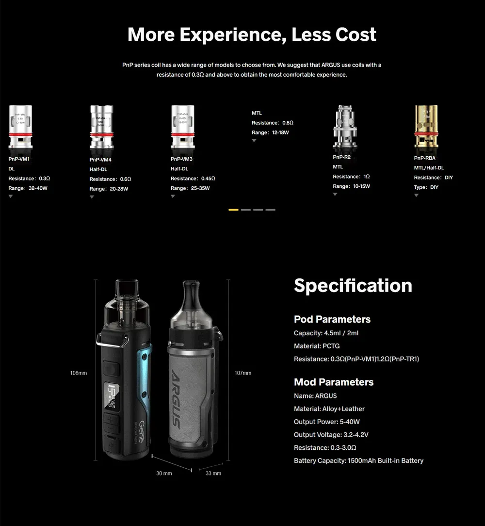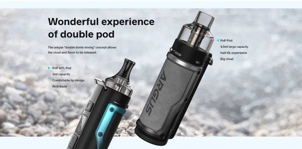 Argus Kit est un kit de système mod pod qui vous apportera un grand plaisir de la vision, du toucher et du goût. Avec sa conception unique à double dosette, il vous offre une toute nouvelle expérience de vapotage. Il y a 2 dosettes disponibles: dosette PnP de 4.5ml et dosette PnP MTL de 2ml. Le Pod PnP convient pour une expérience demi-DL et un grand nuage. Et le Pod PnP MTL est pour un design de lèvres confortable et une saveur riche. De Plus, pour créer la saveur la Plus merveilleuse, il adopte également un système de flux d’air infini innovant. Et équipé de PnP-VM1 Bobine et PnP-R2 Bobine, il est compatible avec PnP Bobines ci-dessus 0.3ohm.