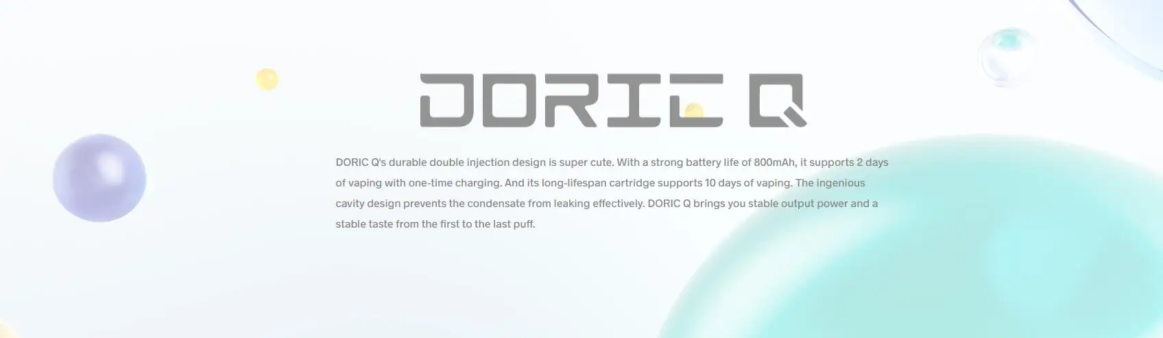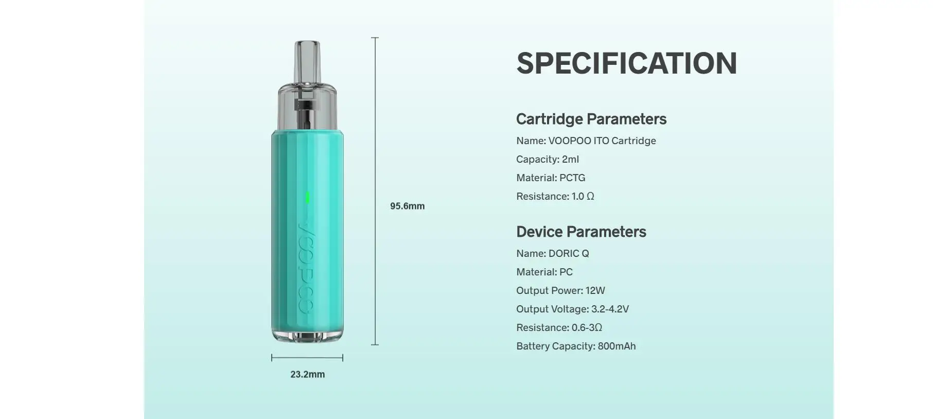 Le Kit Doric Q adopte une conception innovante à double injection pour être mignon et résistant à l’usure. Il est alimenté par une batterie intégrée de 800mAh pour supporter 2 jours de vapotage avec une charge unique. Il peut toujours vous apporter un goût stable de la première à la dernière bouffée avec une puissance de sortie stable. Les 5 protections de sécurité peuvent garantir l’utilisation sûre du Kit. En adoptant la technologie VOOPOO ITO, Doric Q peut vous apporter une grande expérience de vapotage bouche à poumon. Il dispose également de la cartouche longue durée de vie qui peut durer 10 jours de vapotage avec une consommation plutôt économique. La conception ingénieuse de la cavité peut empêcher efficacement le condensat et les fuites. Il a une capacité de 2ml, un système de remplissage latéral facile et une fenêtre de cartouche visible. Il est compatible avec la cartouche VOOPOO ITO 0.7/1.0/1.2Ω, la gousse ITO, la gousse de ITO-X et la bobine ITO.