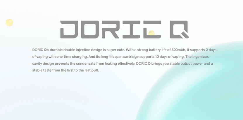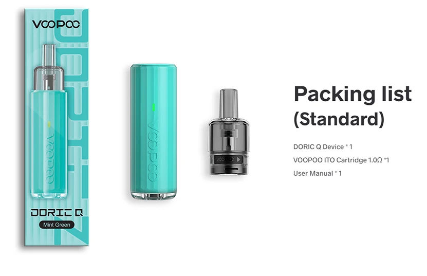 Le Kit Doric Q adopte une conception innovante à double injection pour être mignon et résistant à l’usure. Il est alimenté par une batterie intégrée de 800mAh pour supporter 2 jours de vapotage avec une charge unique. Il peut toujours vous apporter un goût stable de la première à la dernière bouffée avec une puissance de sortie stable. Les 5 protections de sécurité peuvent garantir l’utilisation sûre du Kit. En adoptant la technologie VOOPOO ITO, Doric Q peut vous apporter une grande expérience de vapotage bouche à poumon. Il dispose également de la cartouche longue durée de vie qui peut durer 10 jours de vapotage avec une consommation plutôt économique. La conception ingénieuse de la cavité peut empêcher efficacement le condensat et les fuites. Il a une capacité de 2ml, un système de remplissage latéral facile et une fenêtre de cartouche visible. Il est compatible avec la cartouche VOOPOO ITO 0.7/1.0/1.2Ω, la gousse ITO, la gousse de ITO-X et la bobine ITO.
