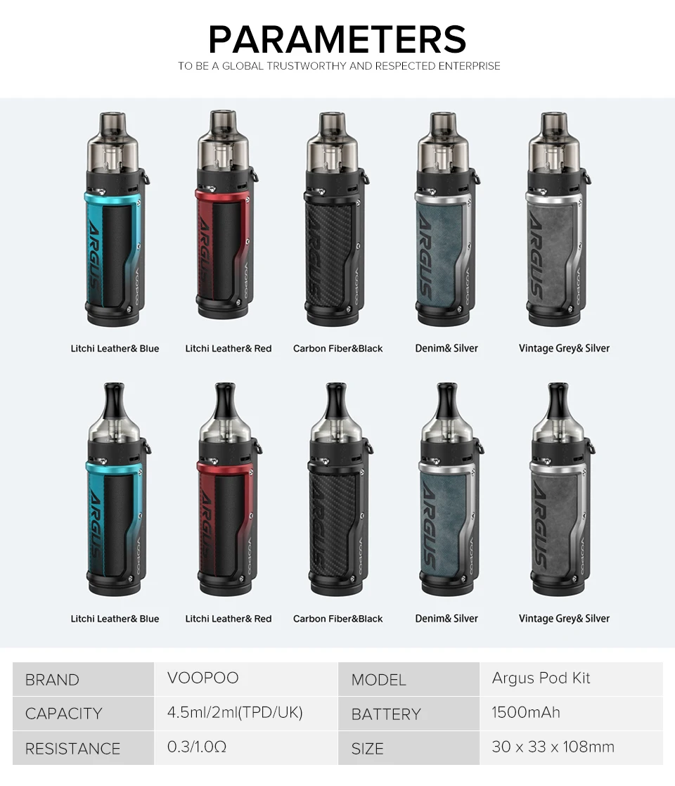 Argus & Argus Pro rafraîchit à nouveau la définition de l’esthétique extérieure. Une fois que vous avez commencé, vous ne pouvez pas les poser. Le Kit Argus Pod a une double cartouche: cartouche PnP avec bobine PnP-VM1 pour vaporisation demi-DL, cartouche PnP MTL avec bobine PnP-R2 pour vaporisation MTL. Et il est équipé d’une batterie intégrée de 1500mAh et Gene. Jeu de puces AI afin qu’il puisse produire à une plage de puissance de 5-40W et supporte smart Mode & vapotage diversifié. Le Kit Argus Pro Pod dispose d’une cartouche PnP à remplissage par le bas transparent, avec une bobine PnP-VM1/PnP-VM6 pour une vaporisation demi-DL. Il est équipé d’une batterie intégrée de 3000mAh et d’un Gene. Jeu de puces TT pour produire à une plage de puissance de 5-80W et prend en charge le mode intelligent et la vaporisation diversifiée. Enfin, les deux sont en métal et en cuir avec un crochet exclusif pour l’extérieur pour une prise en main confortable et un transport pratique.
