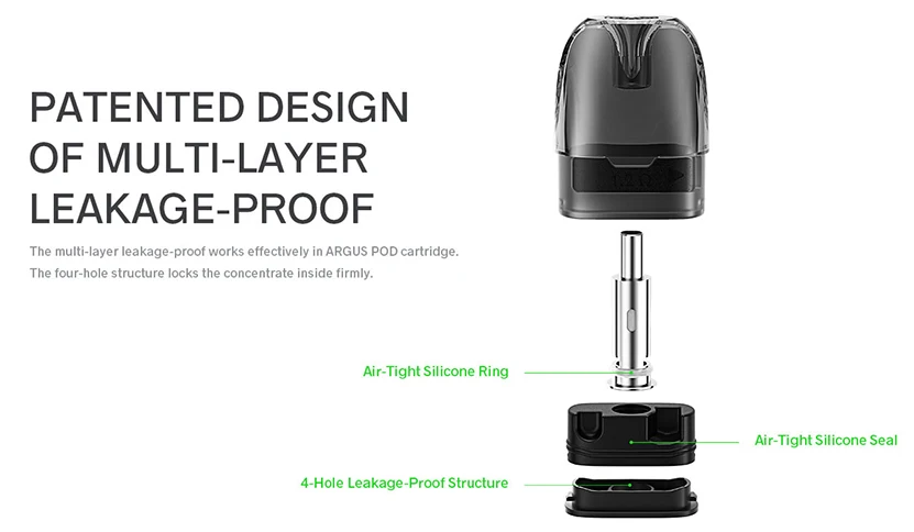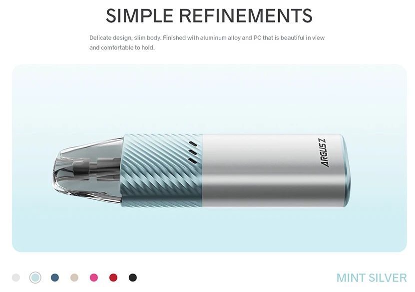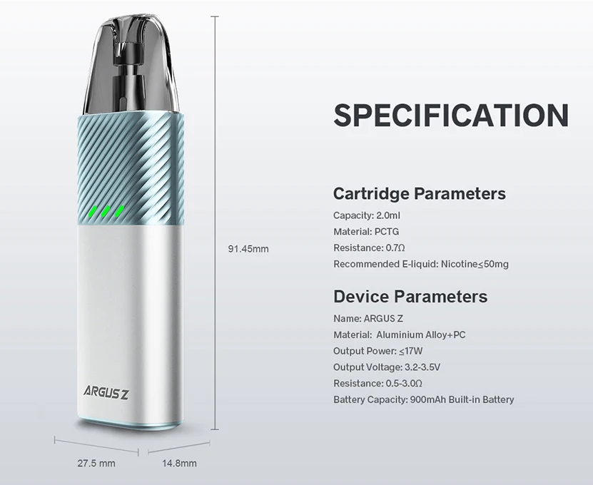 Le Kit Argus Z est un kit système à dosettes petit mais puissant. La batterie intégrée de 900mAh apportera suffisamment de puissance pour un vapotage de deux jours. Fini avec alliage d’aluminium et PC, Argus Z est beau en vue et confortable à tenir. Vous pouvez profiter du vapotage MTL incroyable avec la technologie d’atomisation ITO. En outre, il y a une entrée d’air à 4 trous au fond de la cartouche, et le flux d’air en forme de U peut agrandir le flux d’air, assurer le goût lisse. Vous n’avez pas besoin de vous soucier des fuites avec une conception multicouche étanche aux fuites. Doté de la conception de la connexion magnétique invisible, il est plus facile et serré pour vous de remplacer la cartouche. La cartouche de 2ml est pleine vue, et aussi compatible avec Argus Pod, Argus P1. Munissez-vous du Kit Argus Z pour profiter d’une expérience de vapotage exceptionnelle!