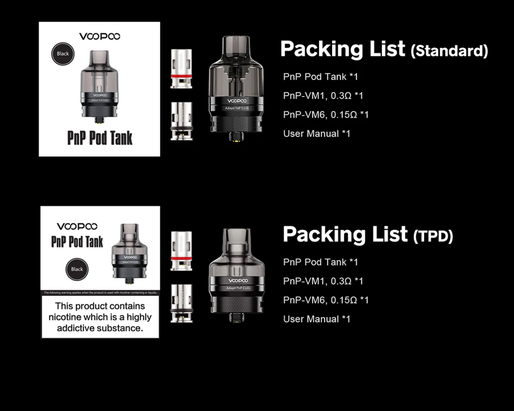 PnP Pod Tank est le nouveau concept d’atomiseur. Il peut basculer entre le Pod et le réservoir. PnP Pod Tank est adapté pour VOOPOO Drag X et Drag S Kit. Il est livré avec une capacité de 4.5ml de jus électronique et une conception de remplissage par le bas. Avec la base 510, le réservoir PnP Pod est compatible avec tout appareil que vous aimez. Il peut être retiré d’une seule main, de sorte que vous pouvez profiter d’une façon plus simple et plus propre de remplir l’huile. Et le nouvel aimant puissant rend le remplacement de la bobine plus facile que jamais. De plus, le réservoir PnP Pod est compatible avec toutes les bobines PnP!