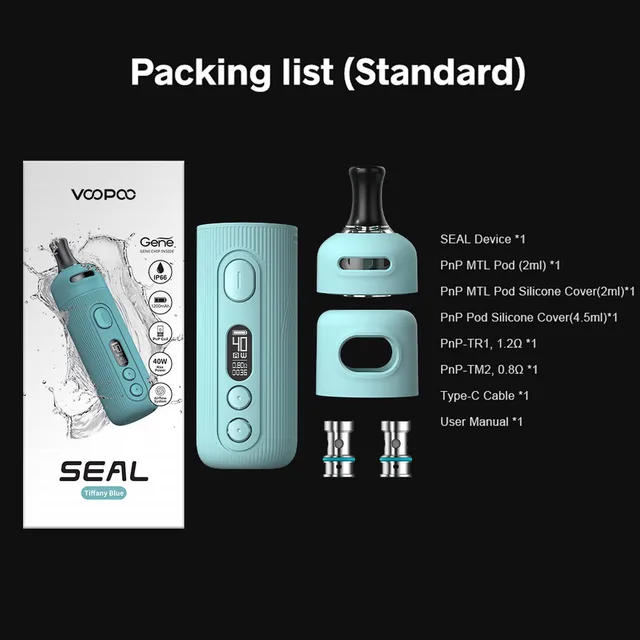 Le Kit de sceau est une toute nouvelle série de Kit VOOPOO Pod Mod. Le Kit est combiné avec Seal Mod et PnP MTL Pod, il est recouvert de silicone liquide doux pour la peau pour une sensation compacte. La batterie intégrée de 1200mAh garantit une sortie maximale de 5-40W avec un port de charge de Type C. La coque en alliage de Zinc offre une protection IP66, empêchant l’intrusion d’eau et de poussière ou les chocs dus aux chutes légères. Le Pod PnP MTL a une capacité de 2ml, la conception d’installation du pod magnétique apporte plus de commodité. Le système de remplissage par le bas avec un bouchon en silicone offrira un niveau de protection plus élevé pour votre e-juice. VOOPOO PnP MTL Pod Tank est compatible avec toutes les séries de bobines PnP.