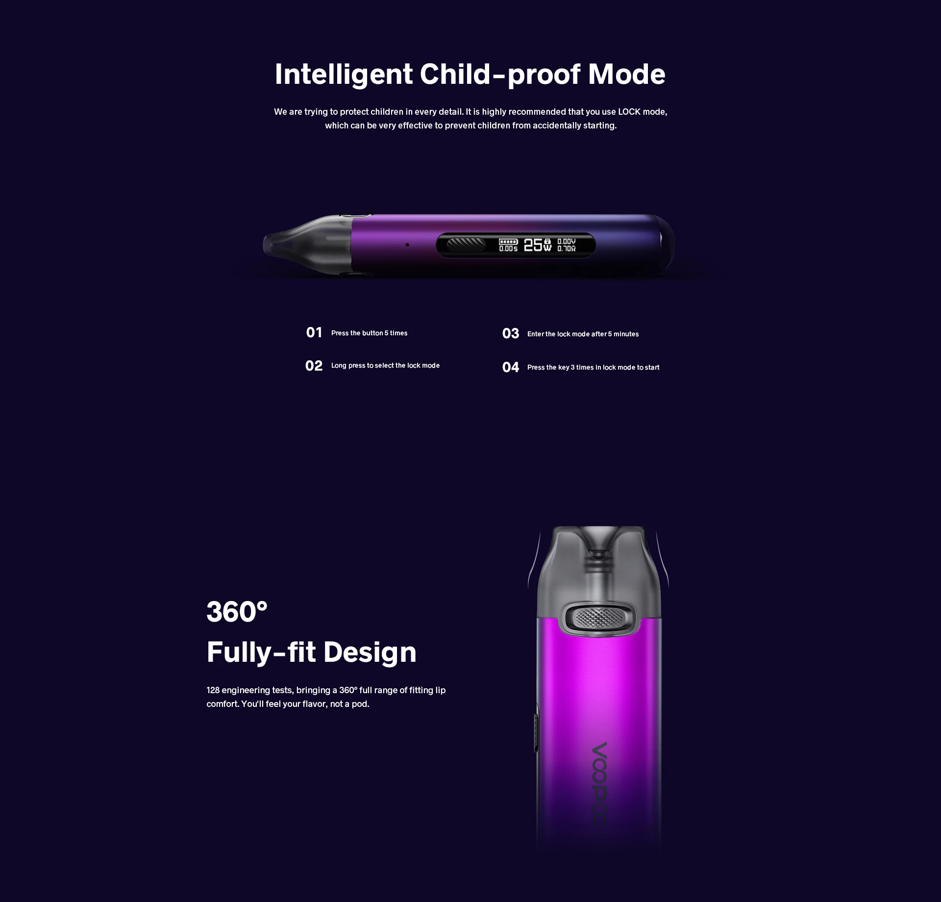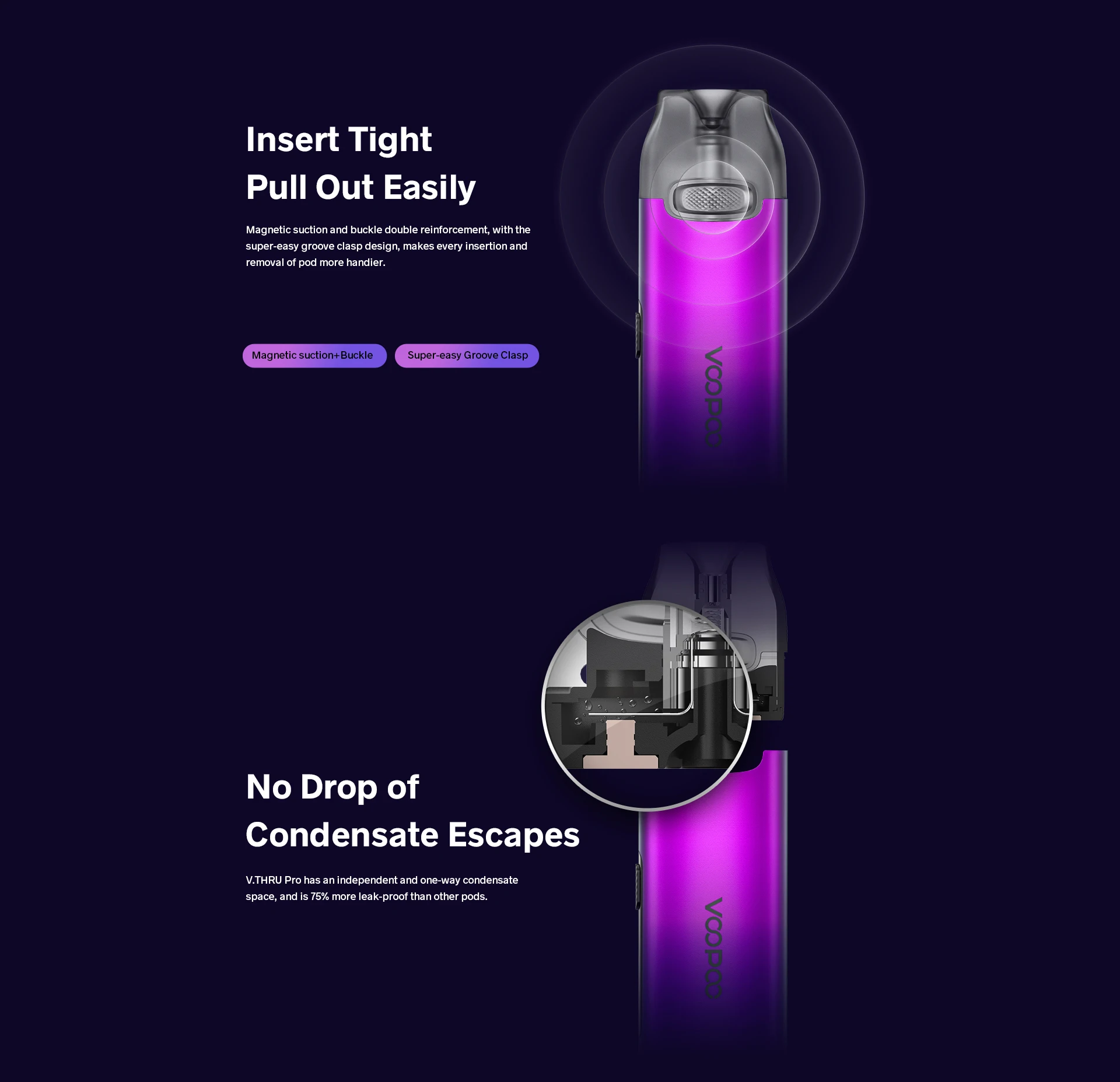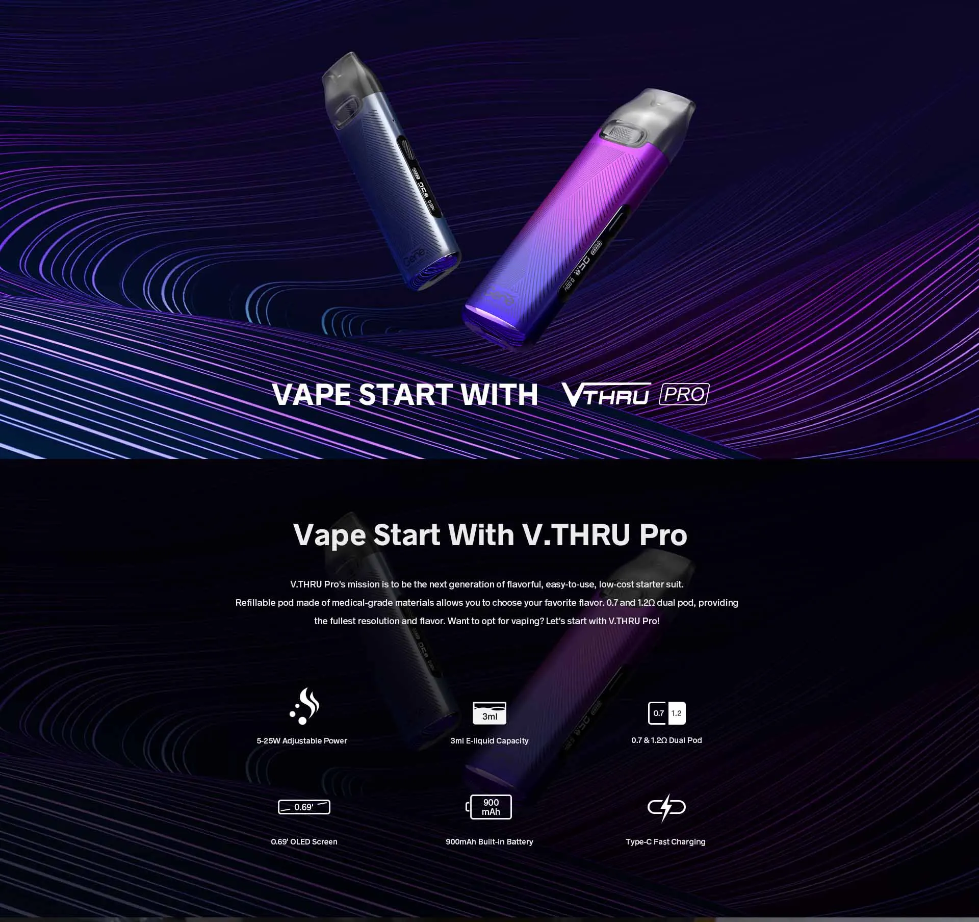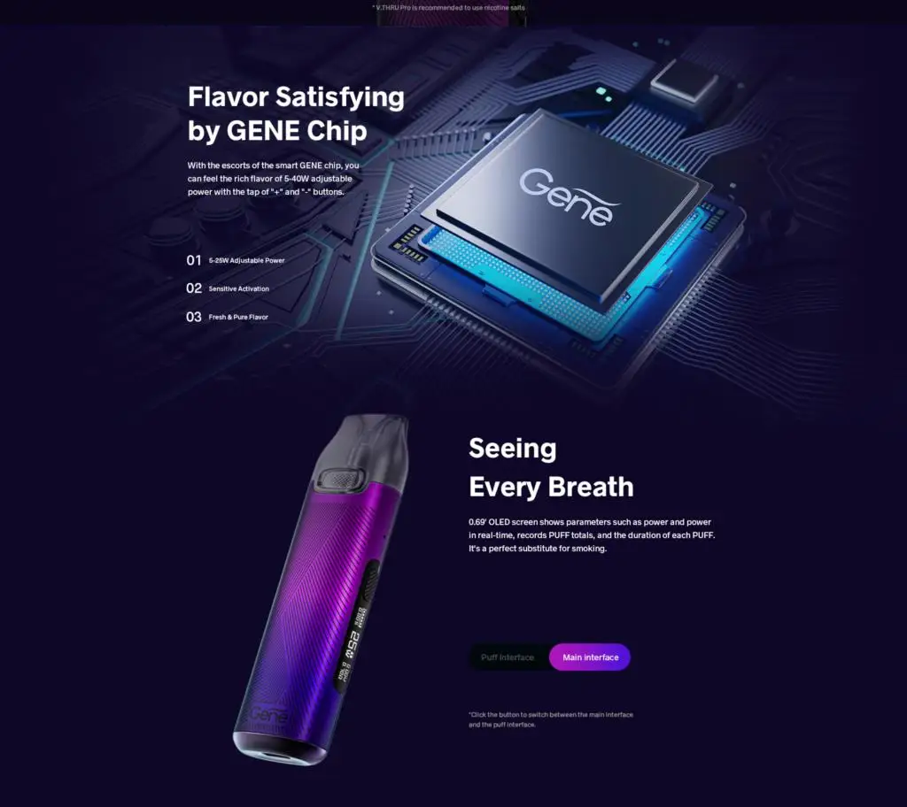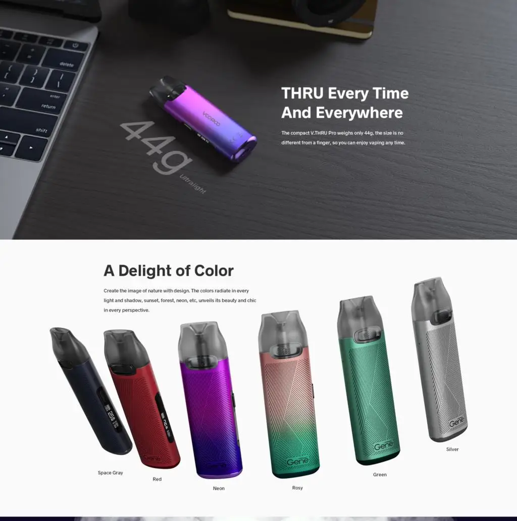 V. THRU Pro Kit est une combinaison de démarrage facile à utiliser et à faible coût qui a une petite taille mais une grande puissance. Il est alimenté par une capacité de batterie intégrée de 900mAh avec une charge rapide type-c 5V/1A. Avec son design sans bouton, v. THRU Pro est facile à démarrer, à ramasser et à inhaler. Il est livré avec 3ml 0.7ohm et 1.2ohm double V.THRU Pro dosettes, qui vous fournira la résolution et la saveur maximale. Et la puce génique apportera une tension de sortie constante pour vous donner une expérience de saveur parfaite. Écran OLED 0.69 pouces vous affiche les informations de l’appareil. Il est également conçu avec le mode intelligent à l’épreuve des enfants pour empêcher les enfants de démarrer accidentellement. Avec le design 360 ° entièrement ajusté, vous sentirez votre saveur, pas une dosette. La conception magnétique d’aspiration et de boucle et la conception super-facile de fermoir de cannelure, le rendent s’insérer serré et retirent facilement.