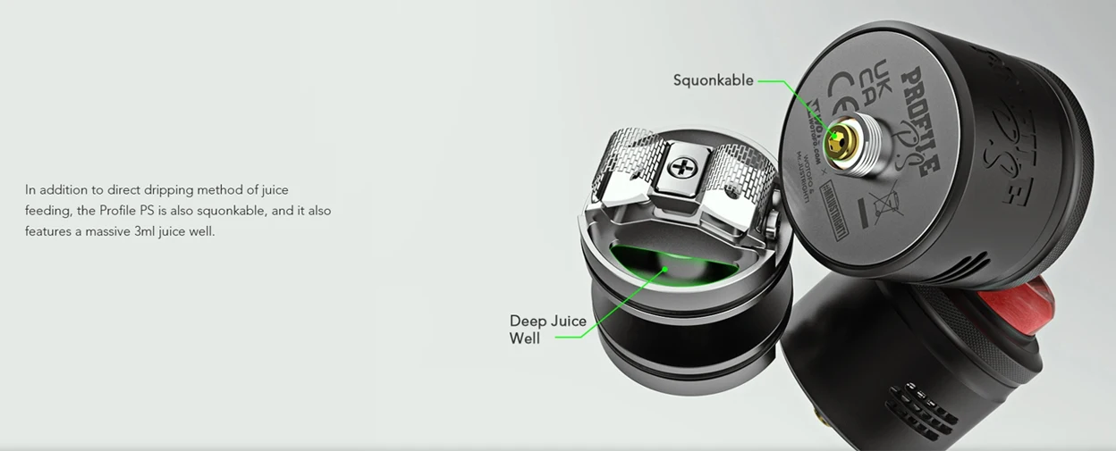 WotofoProfil PS RDA, la collaboration de Wotofo et Mrjustright1, est un RDA à double maille avec pointe d’égouttage en résine 810. Wotofo Profile PS Dual Mesh RDA dispose d’un flux d’air latéral réglable avec nid d’abeille flexible. Wotofo Profile PS prend en charge la méthode d’égouttage direct et le moyen squonkable de remplir le jus électronique.