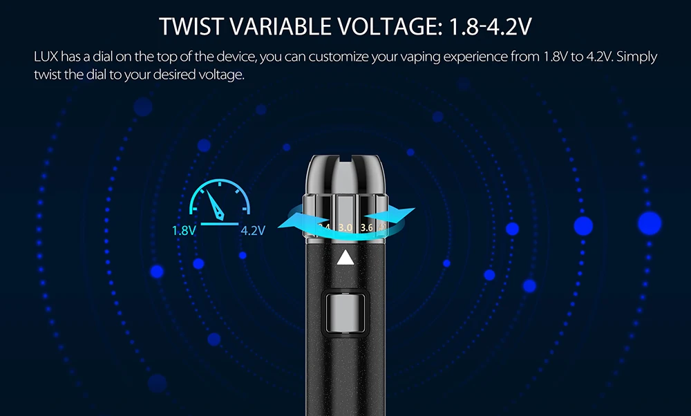 La batterie LUX est livrée avec un corps en alliage de style stylo classique et une conception de cadran de réglage de tension. Vous pouvez personnaliser la tension souhaitée de 1.8V à 4.2V avec le cadran sur le dessus de l’appareil. La fonction de préchauffage en 10 secondes vous aide à préparer les matériaux avant la vaporisation. Il est simple à utiliser, vous pouvez appuyer sur le bouton pour passer à la vapeur. La batterie LUX Pen a une batterie intégrée de 400mAh et convient à toutes les cartouches filetées 510.