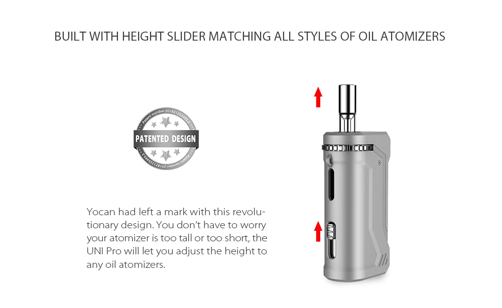 UNI Pro Mod présente une compatibilité universelle avec tous les atomiseurs d’huile, quelle que soit la longueur et la taille. Il est alimenté par une batterie intégrée de 650mAh. Avec le cadran de diamètre réglable qui s’adapte à différents diamètres, il est universel pour tous les types de cartouche d’huile. Equipé d’une fonction de préchauffage 10s, il est préférable de préparer vos matériaux avant de vapoter. Vous pouvez personnaliser votre expérience de vapotage du faible vlotage de 2.0V à 4.2V. Avec le trou de suspension unique, vous pouvez l’utiliser avec votre lanière ou votre porte-clés, ce qui maintient votre appareil en sécurité et offre une accessibilité rapide. En adoptant l’écran d’affichage OLED, il affiche clairement le niveau de puissance réduit pour vous.